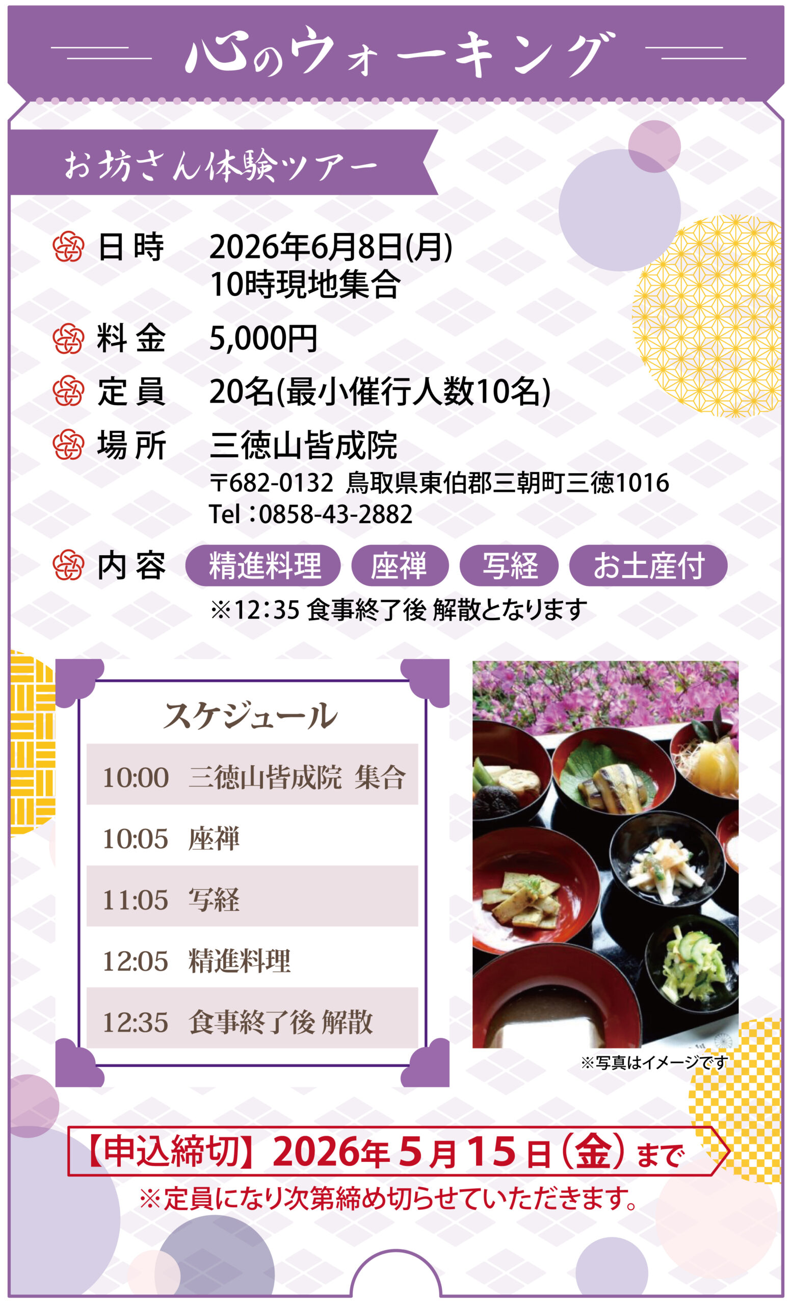 住職から食事のありがたさや「心」のお話を聞き、手作りの自家製ゴマ豆腐をはじめ、地元の野菜を使った精進料理をご堪能いただけます。座禅では、心を静め、呼吸法を学びます。その後は、願いを込めながら「般若心経」を写経していただきます。お子様には「写佛」もあります。
